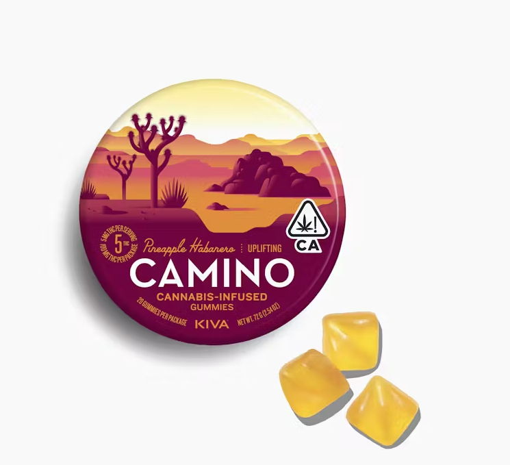 5mg THC per piece | 100mg THC total in 20 pieces A physical road takes you to a physical place. Camino (“road” in Spanish) takes you to a state of mind. Get a taste of the Southwest and invigorate your senses. Kiva’s Pineapple Habanero Camino gummies pair energy-stimulating sativa terpenes with ripe pineapple and a touch of heat. INGREDIENTS: Organic Tapioca Syrup, Sugar. Gelatin, Malic Acid, Natural Flavors, Citric Acid, Cannabis Extract, Fruit and Vegetable Juice for Color, Natural Terpenes, Coconut Oil, Carnauba Wax Gluten-Free and Dairy-Free