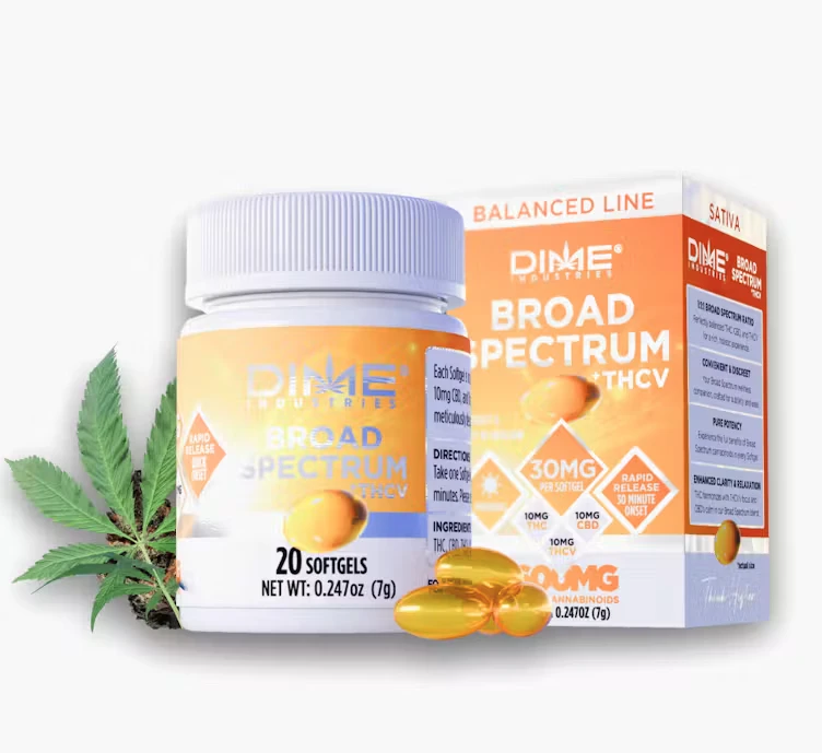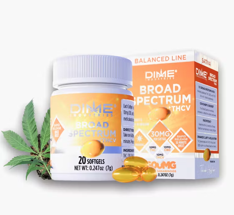 Unlock the comprehensive benefits of our Broad Spectrum formulation! Each Softgel is infused with a harmonious blend of 10mg THC, 10mg CBD, and 10mg THCV - delivering 30mg of total cannabinoids meticulously designed for balance, energy, and well-being.