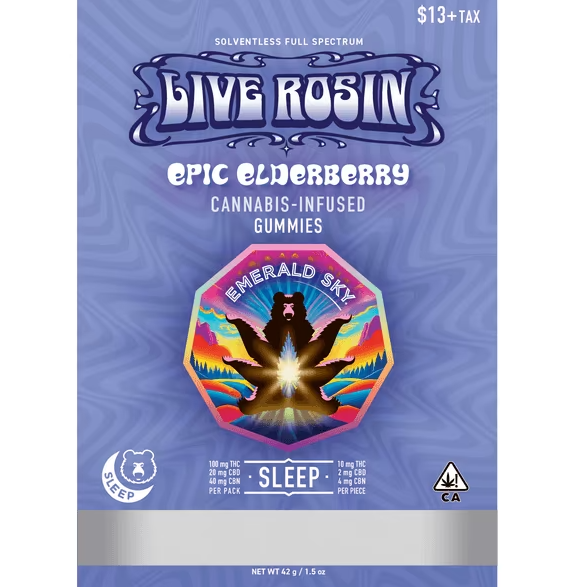 Drift into a galaxy of dreams with our Epic Elderberry Live Rosin gummies. Crafted from Emerald Sky's most popular sleep ratio, each gummy contains 10mg THC, 2mg CBD, and 4mg CBN. These rich, juicy elderberry-flavored gummies are your ticket to a restful night's sleep, transporting you to a serene universe of relaxation. Let the cosmic blend of cannabinoids guide you to a peaceful slumber among the stars.