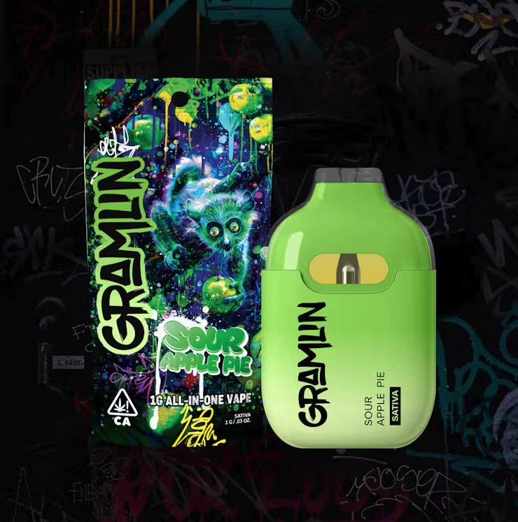 This full gram All-In-One Vape is ready to smoke out of the bag. With tart green apple and sweet doughy flavors, this Sour Apple Pie sativa vape's quality ceramic coil and filter tech mean big flavor and bigger clouds. The inhale-activated LED blinks 2x for heat-protection or 10x for low battery. USB Type-C recharbeable cord not included. No buttons, no fuss, just rip to unlock Gramlin Mode. @gramlinmode | gramlinmode.com