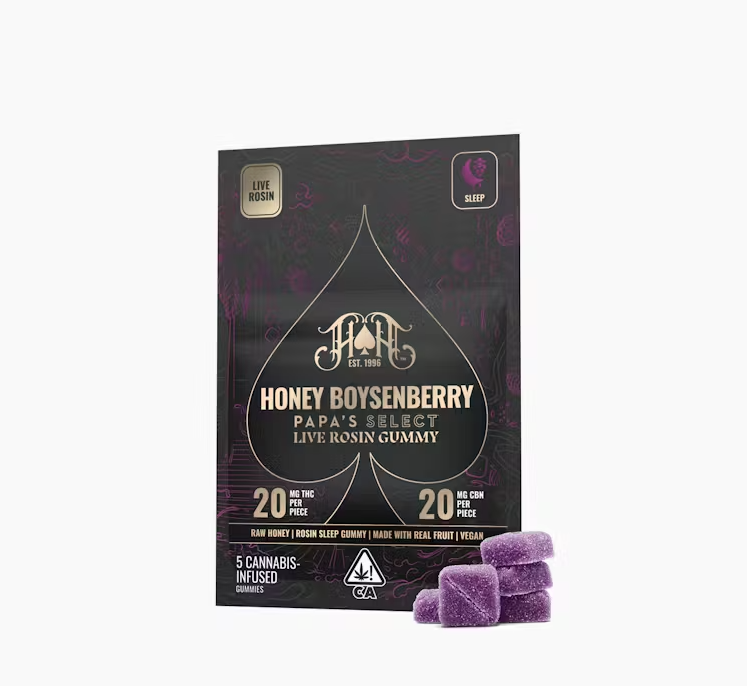 "UNWIND WITH THE RICH, SOOTHING FLAVOR OF HONEY AND BOYSENBERRY, INFUSED WITH FIRST-PRESS LIVE ROSIN FROM AWARD-WINNING PAPA SELECT HASH. THIS FULL-SPECTRUM GUMMY BLENDS CBN AND THC FOR A NATURALLY POTENT, DEEPLY RELAXING SLEEP EXPERIENCE.