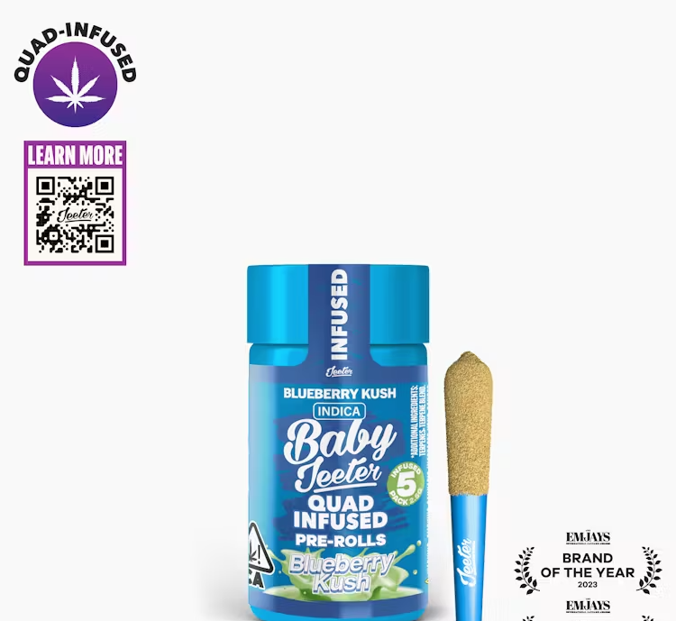 Blueberry Kush | Baby Jeeter | Indica 5 x 0.5G Joints 2.5G Total Quad-Infused | Premium Flower Infused with THCa Diamonds, Rosin, & Kief