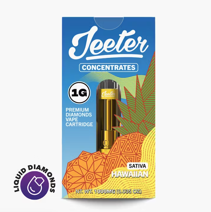 Hawaiian Jeeter Concentrates Diamonds Vape Cartridge : 1000 mg | Sativa | 90.09% THC (Per Cartridge) Get whisked away to a blissful tropical island with Hawaiian, a bright sativa strain originating from, you guessed it, Hawaii. This tasty strain boasts a bright aroma and flavor profile of tropical, sweet and citrusy fruits. Think of sinking your teeth into some juicy, freshly cut pineapple. Hawaiian’s uplifting and energizing effects align well with hitting the beach and having fun in the sun.