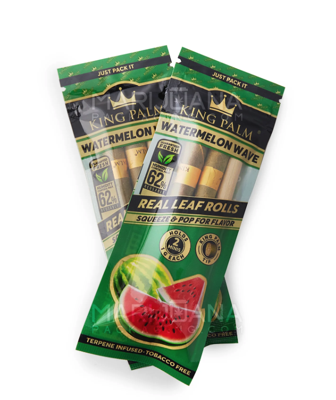 The King Palm Flavored Mini Rolls are perfect for fast and easy joint preparation, with no mess. These natural-leaf wraps are perfect for The product smoker who still hasn’t perfected how to roll a joint. Just fill the wrap with your slightly chunky product, pack it with the wooden tamper (included in each two-pack), and light up. There’s no need to split King Palm’s Mini Rolls, you don’t have to lick them – these wraps are built for speed, and they take all the work out of all-natural smoke session. Squeeze & Pop: When you smoke a King Palm Flavors wrap, just squeeze the red band around the corn husk tip at its base for a smooth, clean pop of Watermelon flavor. The leaves: King Palm’s natural leaf rolls are slow-burning, hand-made, bio-degradable, and sustainable; grown on a collective of farms across Southeast Asia. The leaves burn extra slow and contain no added chemicals or tobacco. What's left is a smooth burning, full-flavored smokable packed with your favorite herbs.