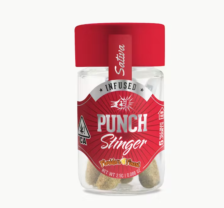 Floridas Finest Punch Stingers delivers a burst of citrusy goodness with each puff, making for a refreshing and delicious smoking experience.The Sativa strain provides a uplifting and energizing high, perfect for daytime use.delivers a burst of citrusy goodness with each puff, making for a refreshing and delicious smoking experience. Elevate your smoking game with our Sativa Floridas finest infused pre-rolls!
