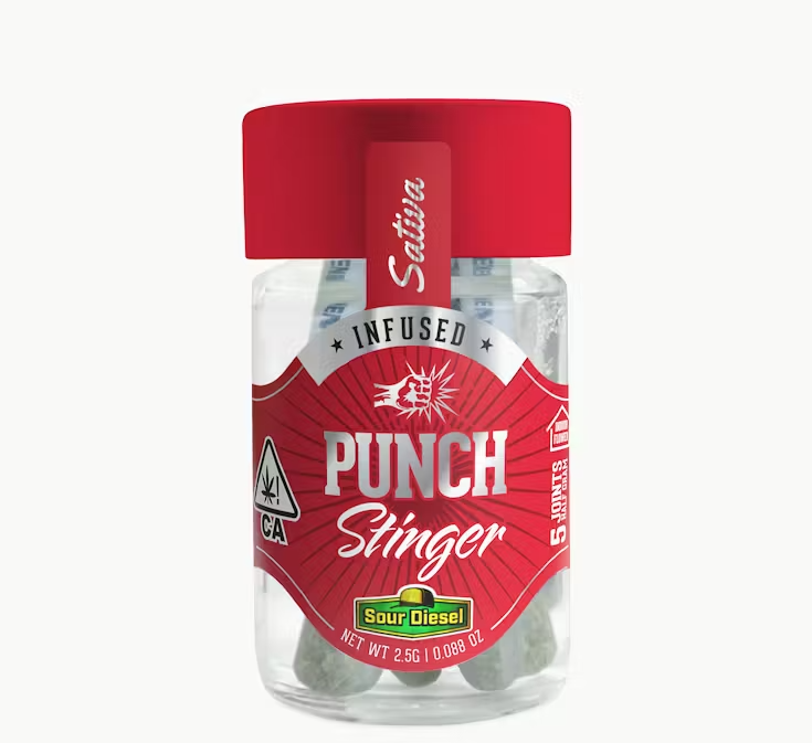 The Sour Diesel Punch Stingers flavor has a pungent, diesel-like aroma with hints of citrus and earthy undertones. When smoked, it has a distinct sour taste that is both tangy and slightly sweet, with notes of lemon and herbal flavors. It's a classic strain known for its energizing and uplifting effects, making it a great choice for daytime use.Each pack contains five infused pre-rolls that are expertly rolled in kief, delivering a premium smoking experience.