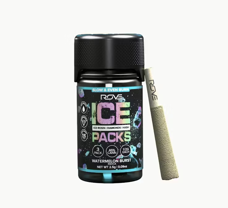Rove Ice Packs, the world’s first triple-infused preroll. Made with premium-grade flower fully-infused with THCA diamonds and solventless ice hash rosin, they're expertly rolled, then coated with more ice hash. Super smooth and ultra potent, Rove Ice Packs test at over 50% THC. Welcome to the next evolution of prerolls.
