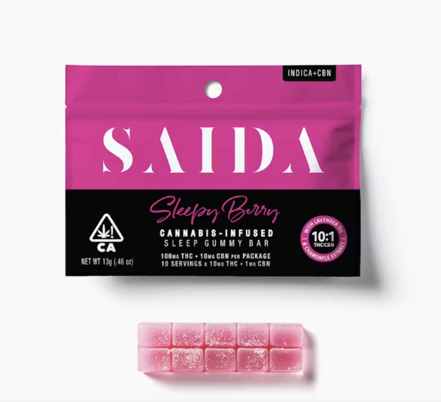 SAIDA's bite-sized Sleepy Berry Gummy Bars are packed with THC & CBN, bursting with flavor, and infused with Chamomile Extract and Lavender Oil. We crafted them to perfection but priced them with value in mind. Each bar has 10 delicious pieces. They're also vegan, gluten-free, non-melting, and made with natural colors.