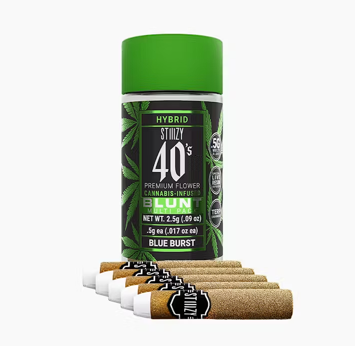 STIIIZY 40’s Mini Blunts Multipack is filled with premium grown STIIIZY cannabis and packed in individual glass vials to maintain freshness and potency. Each 40’s Mini Blunt is rolled with 100% tobacco free, kief dusted hemp wraps which packs a flavorful and potent punch with every exhale, and the tightly secured custom glass tips have been perfected to provide an amazing and consistent burn every time. The STIIIZY 40’s Mini Blunts Multipack is reinventing your high experience by being one of the first to introduce 40% THC and total cannabinoids potency with special live resin infusion.