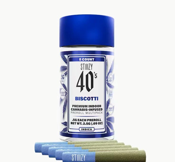 Elevate your pre-roll game. Stiiizy 40s pre-rolls are setting the standard with high potency, cannabis infused joints coated evenly with kief. Using our proprietary live resin infusion methods, we’ve designed every pre-roll to offer 40%+ THC potency with a unique flavor profile. With a smooth inhale and tasteful exhale, each and every Stiiizy 40 is packed with indoor grown flower, specifically made to ensure a potent and long-lasting high. Spark up the 40s.