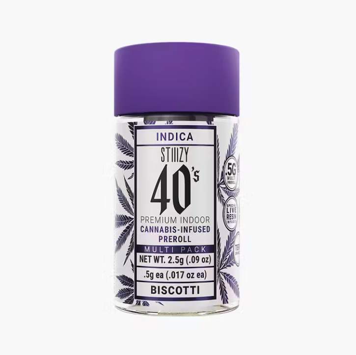 Elevate your pre-roll game. Stiiizy 40s pre-rolls are setting the standard with high potency, cannabis infused joints coated evenly with kief. Using our proprietary live resin infusion methods, we’ve designed every pre-roll to offer 40%+ THC potency with a unique flavor profile. With a smooth inhale and tasteful exhale, each and every Stiiizy 40 is packed with indoor grown flower, specifically made to ensure a potent and long-lasting high. Spark up the 40s. BISCOTTI TASTE: Earthy, Pine, Nutty FEELING: Relaxing, Sleepy, Giggly DESCRIPTION: An Indica-dominant strain that comes from Gelato #25 and South Florida OG. Biscotti delivers a powerful body high and delicious flavor.