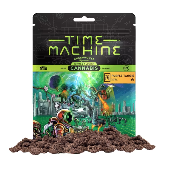 At Time Machine, we've rewound the clock and fast-forwarded the vibe to bring you Purple Tangie, a citrus-charged sativa that feels like sunrise in a parallel dimension. Born from the zesty Tangie lineage, this strain was cultivated with precision and intention, fusing old-school sunshine energy with future-forward growing techniques. The bright orange-peel aroma, layered with subtle spice and herb, sparks a sensory flashback to carefree days while launching your mind into inspired orbit. Purple Tangie's smooth, euphoric lift activates creativity, enhances conversation, and turns solo moments into full-on cosmic brainstorming sessions. Whether you're creating, connecting, or just catching a vibe, this is the kind of time travel you can taste. Fire it up and let Purple Tangie shift your timeline.Step into the Time Machine and experience cannabis like never before! Our hydroponic greenhouse-grown flower is a blast from the past with a futuristic twist, cultivated in state-of-the-art greenhouses that combine the sunny vibes of the '70s with tomorrow's technology. We've mastered a closed-loop system that reuses water like it's 2099, making each puff a guilt-free trip through time. Picture yourself lounging in a '90s neon rave or cruising in a classic '80s convertible—this is cannabis that captures the essence of every decade, all while pushing the boundaries of what's possible. Whether you're sparking up to reminisce or to forge new memories, our flower is your ticket to a timeless experience. Available in 1/8oz (3.5g), 1/4oz (7g), 1/2oz (14g), and 1oz (28g) pouches. Smoke like the future depends on it!